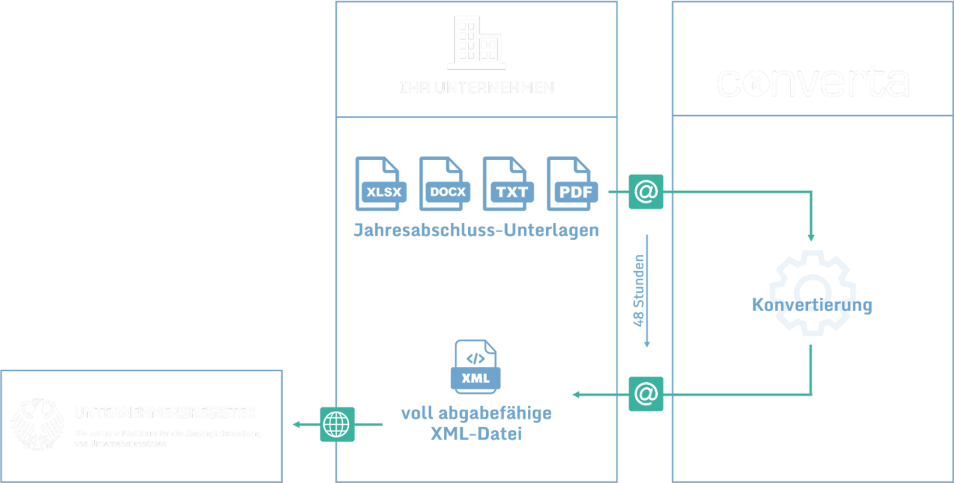Die von uns entwickelte Dienstleistung ist für Sie komfortabel, sicher und entspricht stets den aktuellen Anforderungen des Unternehmensregisters. Eine Software-Installation ist in Ihrem Hause nicht notwendig.